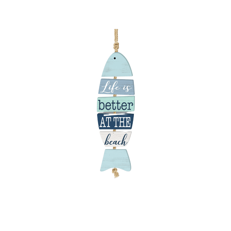 Add a coastal charm to your space with this “Life is Better at the Beach” Hanging Ornament. Designed in the shape of a fish, this beach-inspired wooden wall decor features pastel blue tones and nautical-style rope accents. The rustic plank design and uplifting message make it a perfect addition to any beach house, coastal-themed room, or ocean-inspired decor.