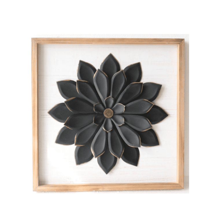 Enhance your home or office with this elegant wholesale framed metal flower wall art. Featuring a beautifully layered black metal flower with gold-accented edges, this statement piece adds a modern yet rustic charm to any space. The natural wooden frame complements the distressed white background, creating a perfect balance of contemporary and farmhouse aesthetics. Ideal for living rooms, bedrooms, offices, and entryways, this decor item is a must-have for retailers looking for metal wall art wholesale and bulk home decor.