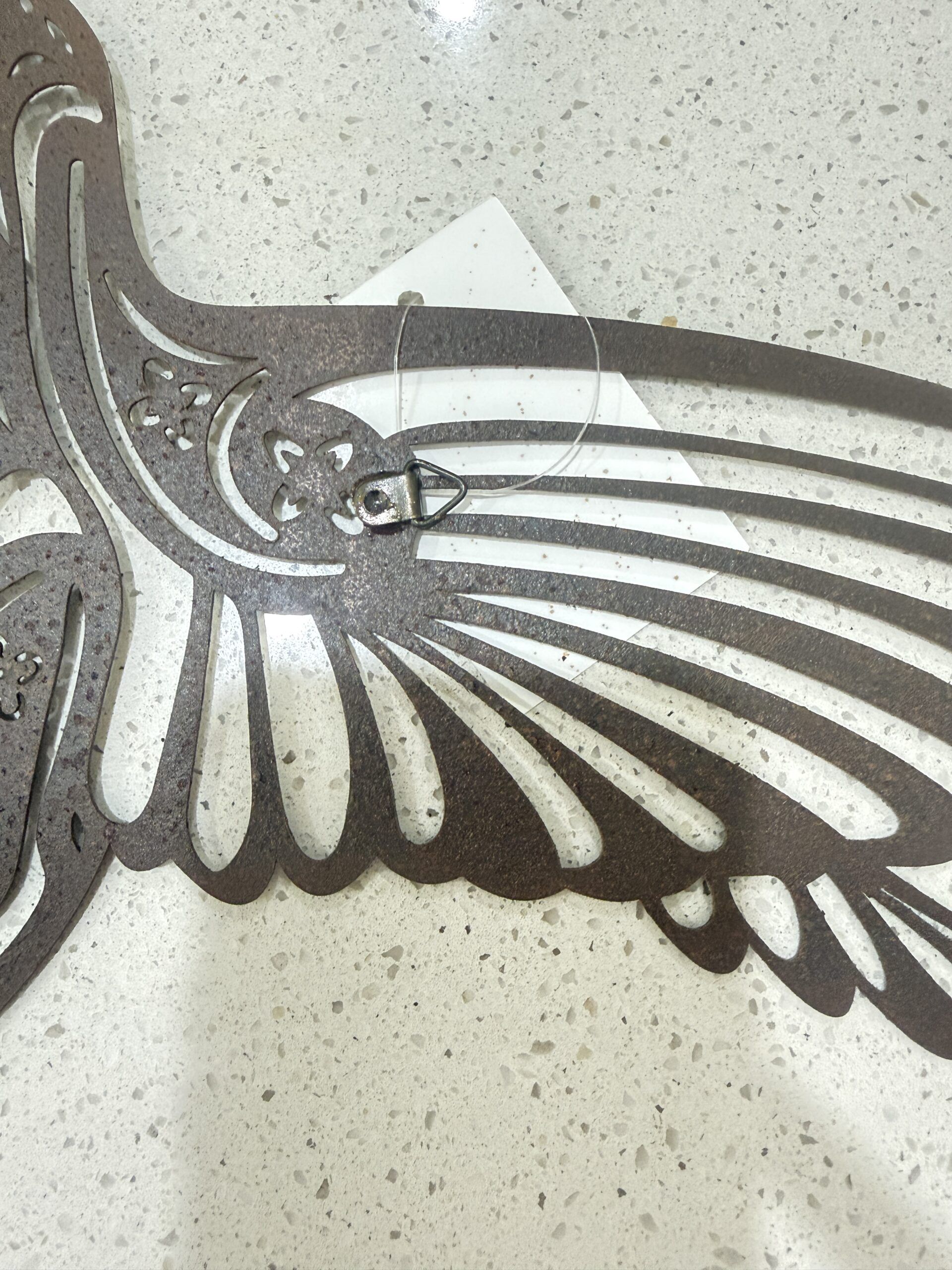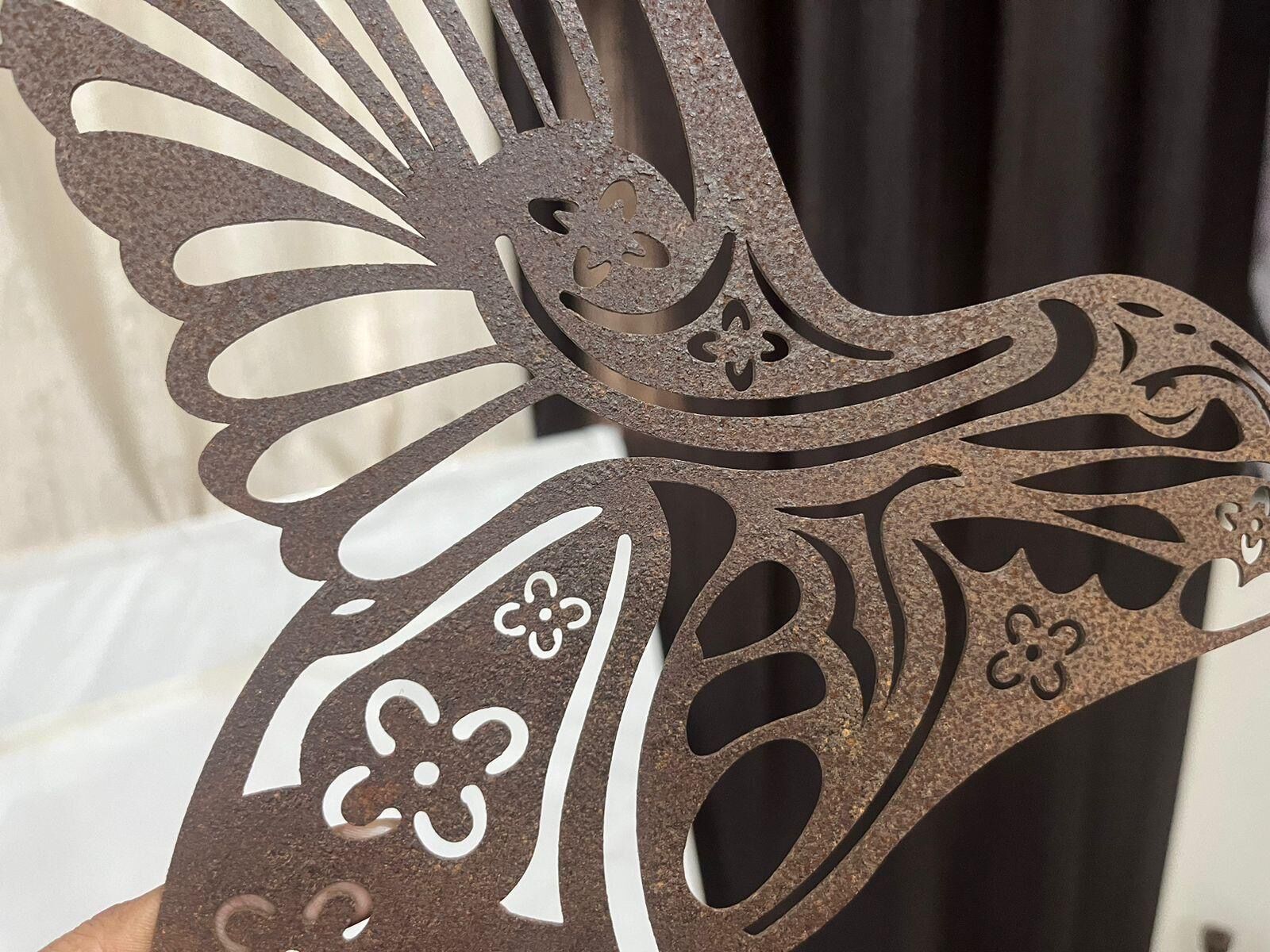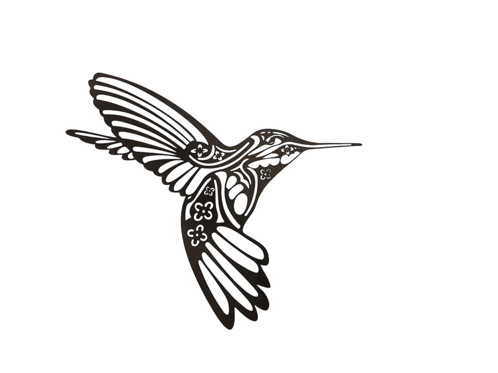 This elegant piece, sized at approximately wide by high, showcases a hummingbird in flight, rendered as a striking black silhouette. The artistry is in the detail: the body is filled with beautiful, intricate laser-cut floral and swirl patterns, transforming the bird into a decorative masterpiece.