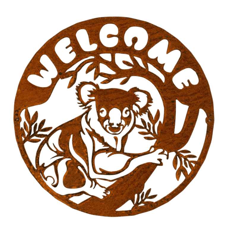 Enhance your decor collection with this Koala Welcome Metal Wall Art, a beautifully crafted rustic metal sign featuring an intricately designed koala on a tree with “WELCOME” lettering. Made from high-quality metal with a weathered, rusted finish, this 60cm round metal wall art is perfect for Australian-themed decor, outdoor patios, gardens, and entryways.