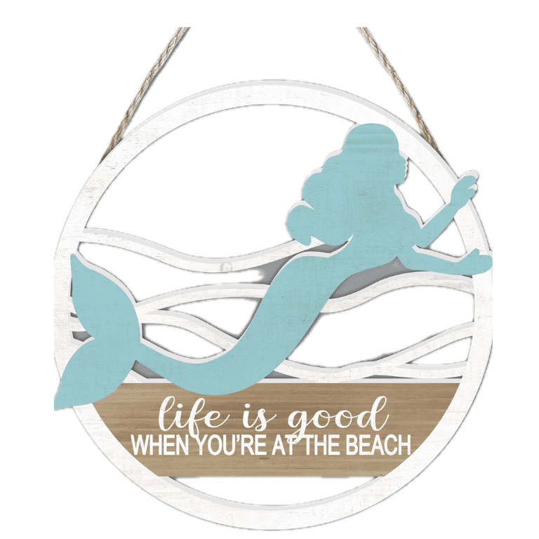 Enhance any coastal-themed space with this wholesale mermaid wall art. Featuring a serene mermaid silhouette, flowing ocean waves, and the phrase “Life is Good When You’re at the Beach,” this wooden wall sign is perfect for beach house decor, nautical-themed stores, and seaside gift shops. Crafted from high-quality wood with a rustic white and blue finish, it comes with a sturdy rope for effortless hanging. An excellent bulk-buy item for retailers looking for stylish coastal decor wholesale.