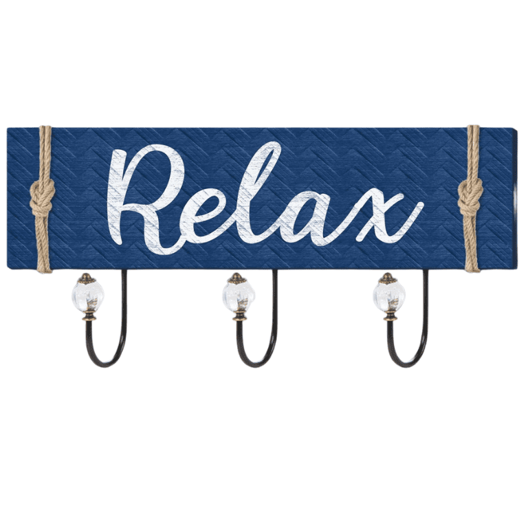 Bring a relaxing beach vibe to your home with this “Relax” Wall Hook Rack. Designed with a deep blue wood finish, nautical rope accents, and elegant white script, this charming piece blends functionality with coastal aesthetics. Featuring three durable metal hooks adorned with decorative glass knobs, it is ideal for hanging towels, hats, keys, or accessories in entryways, bathrooms, or bedrooms.