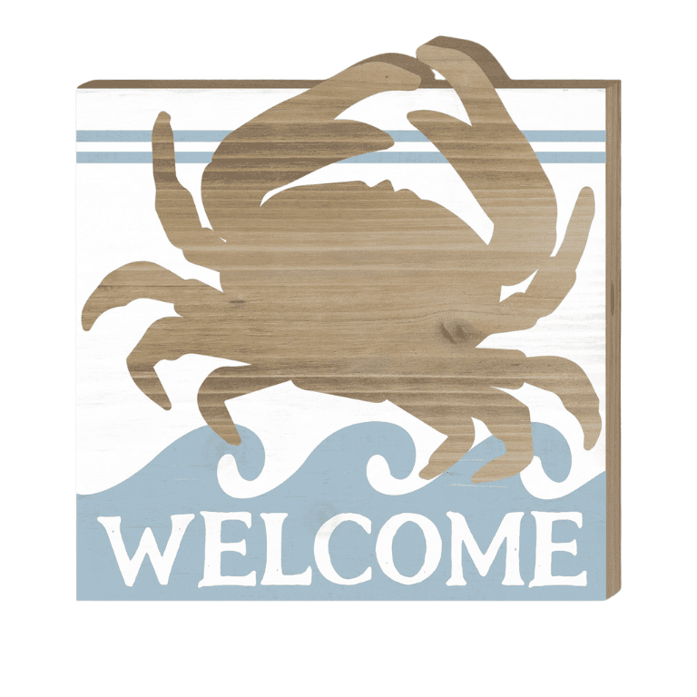Welcome guests into your home with a touch of coastal charm using this beautifully crafted wooden sign. The sign features a large crab silhouette in a natural wood finish, set against a white background with a light blue wave design. Below the crab, the word “WELCOME” is prominently displayed in bold white letters, making it a perfect addition to any entryway or living space.